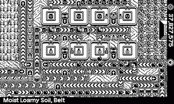 Factory Farming's simulation performance has been checked on the Playdate hardware using a test factory with a total of 6,300 buildings, crops and conveyor belts, and with 3,000 pieces of cargo moving around the facility on conveyor belts at any one time. Factories cannot grow very much larger than this due to the limited plot size.
